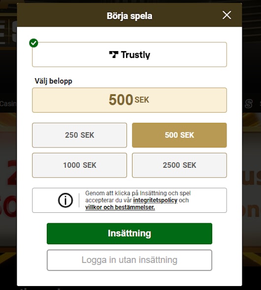 Nästa steg är ett snabbt och problemfritt sätt att starta vårt nya konto på hos Mega Riches eftersom de använder sig av såväl Trustly som BankID. Du behöver alltså inte fylla i några andra uppgifter så som adress eller bonuskoder, utan tänk på att bara sätta in så den summa pengar som du tror att du kommer hinna omsätta på 60 dagar.