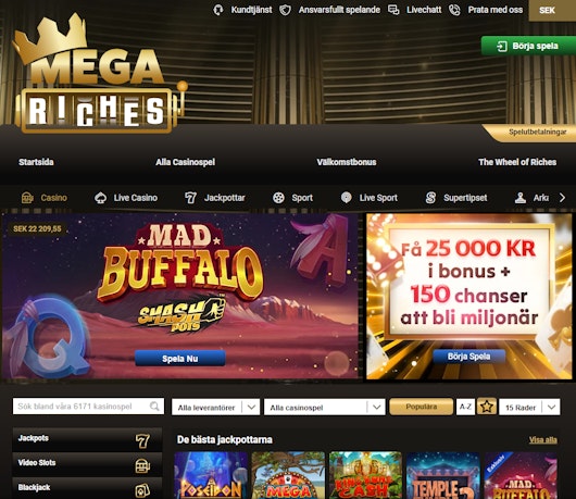 Mega Riches är ett sprillans nytt casino på svenska marknaden som lanserades så sent som under maj 2025. Här väntar en gigantisk bonus och ett utbud av högsta klass! Dessutom prioriterar man smidiga transaktioner med hjälp av bekväma och enkla metoder som sker med hjälp av BankID och Trustly. Kort sagt - ett casino som vi anser levererar det man önskar som spelare!