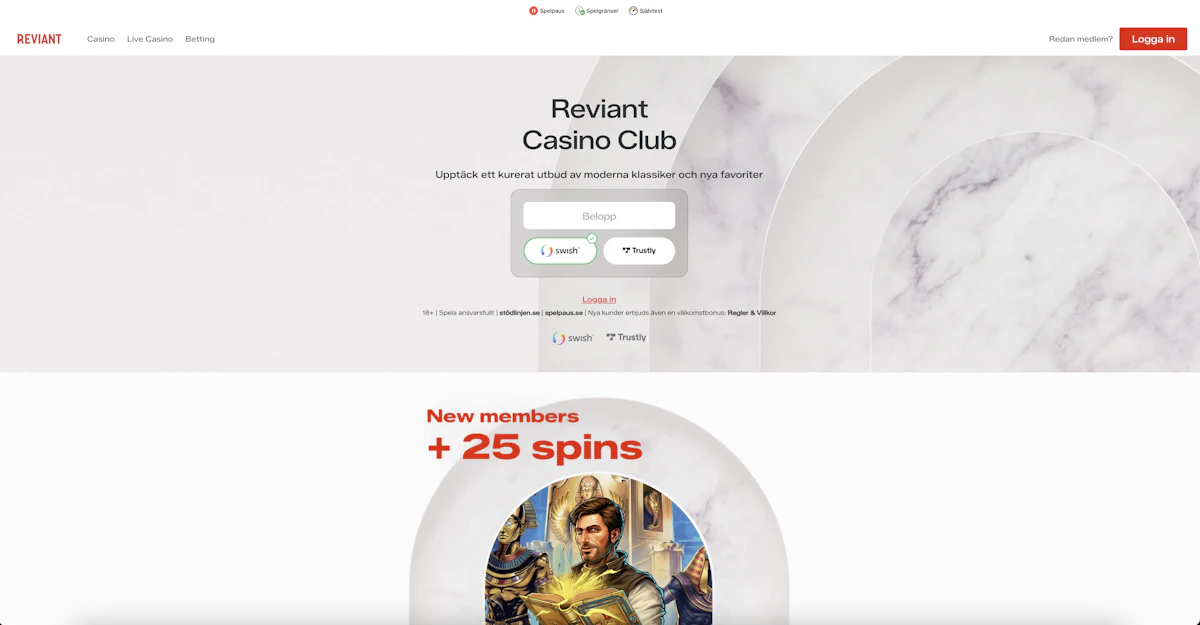 Reviant drivs som ett rent Pay n Play-casino, vilket innebär snabb registrering utan traditionella formulär. Inloggning och verifiering sker smidigt med BankID, och betalningar hanteras via Swish och Trustly.