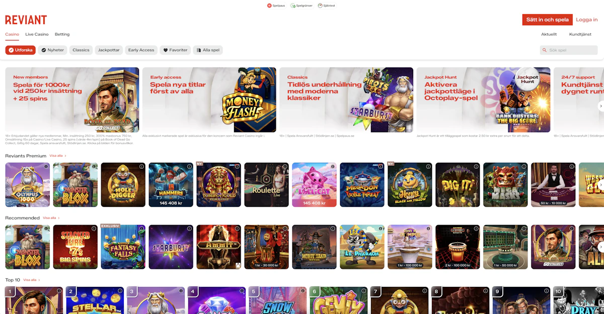 Hos Reviant hittar du främst slots, live casino och klassiska bordsspel. Sajten erbjuder även exklusiva spel och tidig tillgång till vissa titlar från Spin On.
