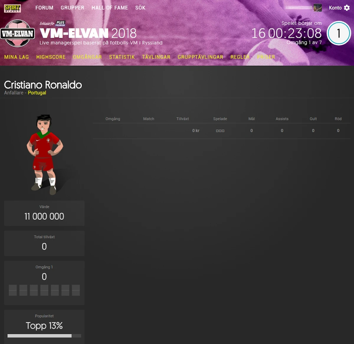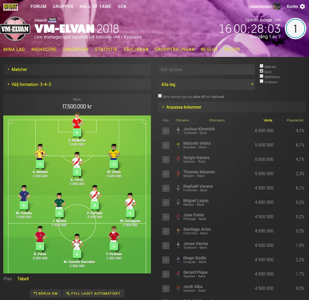 Nedanför går vi igenom tips på målvakter, försvarare och anfallare inför VM-Elvan 2018. Hos Aftonbladet har man en budget på 50 miljoner vilket gör att man i snitt kan lägga 4.5 miljoner per spelare vilket vi utgår ifrån med våra tips. Vi utgår också från en klassisk 4-4-2 formation.